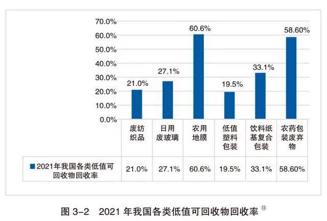2021年,我國各類低值可回收物總的回收量約為2547萬噸,回收率約為26.6%。其中,廢舊農(nóng)用地膜回收率達到60.6%,農(nóng)藥包裝廢棄物、飲料紙基復合包裝、日用廢 玻璃、廢舊紡織品、低值塑料包裝的回收率依次為58.6%、33.1%、27.1%、21%和19.5%,總體回收利用率低。