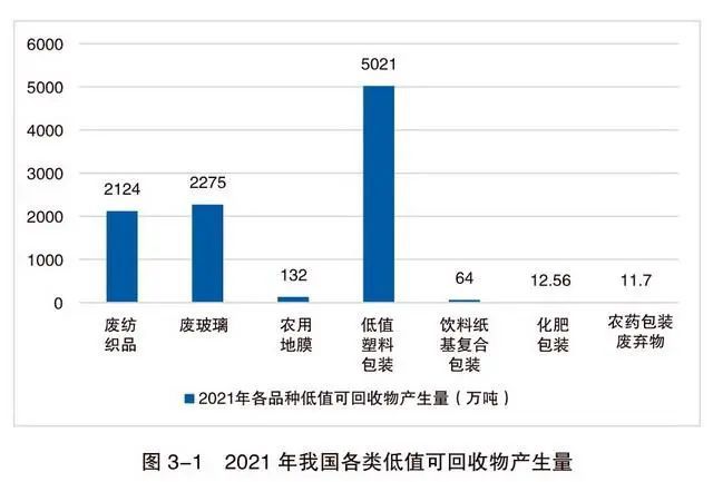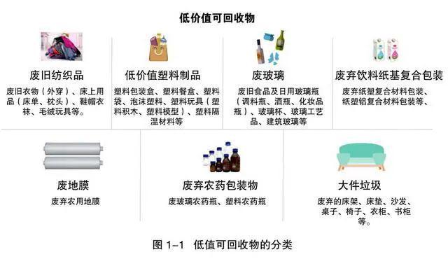 根據(jù)報告,低值可回收物是一個與報廢汽車、廢家電等高價值廢棄物相對的概念,主要是指在生產(chǎn)生活中產(chǎn)生的具有一定回收利用價值,能夠通過一定技術(shù)經(jīng)濟手段實現(xiàn)材料化回收利用并獲得一定經(jīng)濟效益的各類廢棄物,但由于對其回收利用的經(jīng)濟效益較差,單純依靠經(jīng)營主體自發(fā)行為難以實現(xiàn)高比例回收利用,如廢玻璃、廢舊紡織品、飲料紙基復合包裝、低值塑料包裝、化肥農(nóng)藥包裝、地膜等。